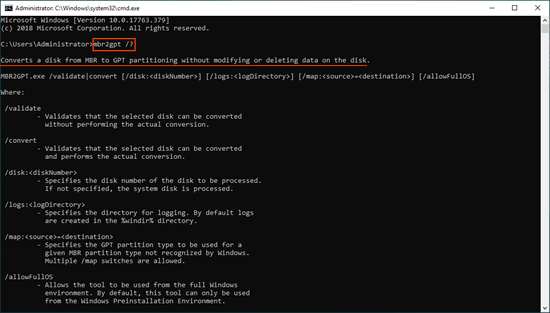 If you want to read more about MBR2GPT, input mbr2gpt /? in the command window or visit official page.