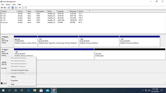 When there's a partition on this disk, you cannot convert disk type in Disk Management, because the convert option is grayed out.